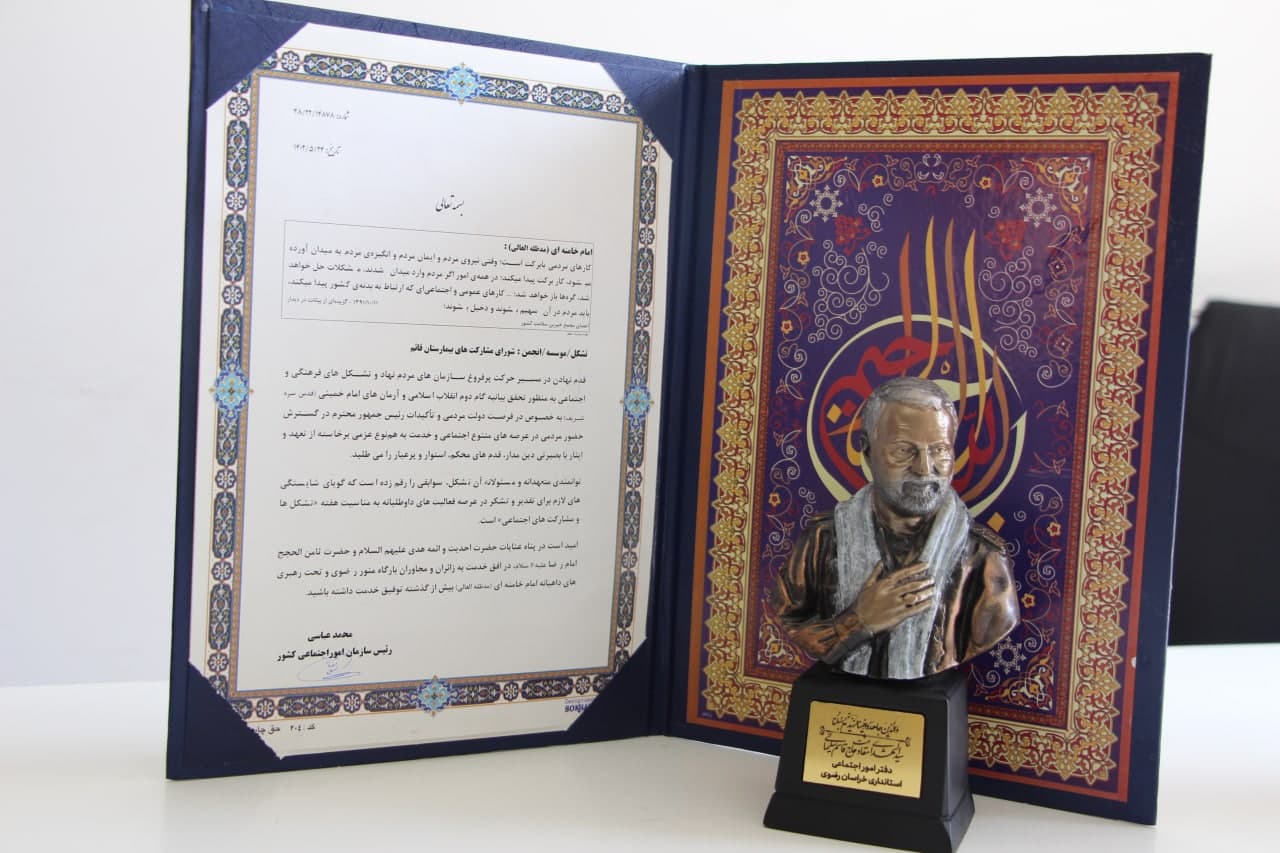 رئیس سازمان مشارکت های اجتماعی کشور با اهدای لوح سپاس و تندیس از خدمات و تلاش های ارزنده مسئولین مرکز مشارکتهای مردمی بیمارستان قائم (عج) تقدیر کرد.